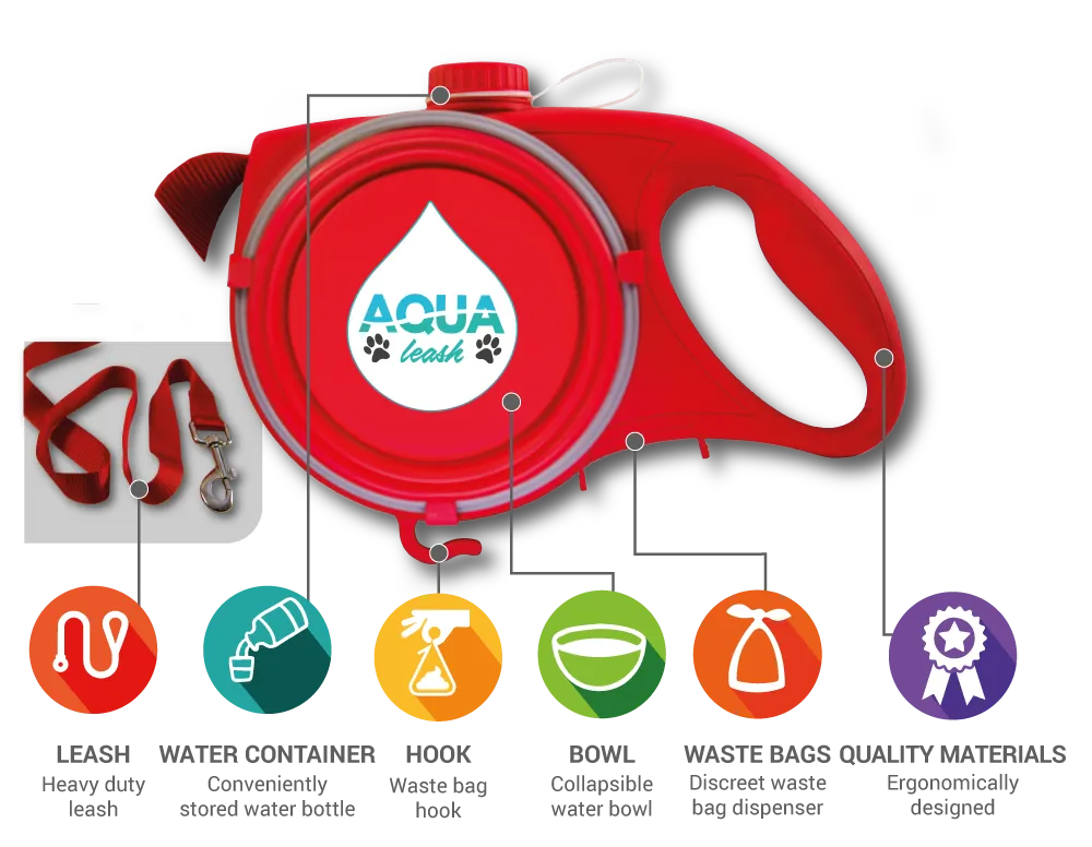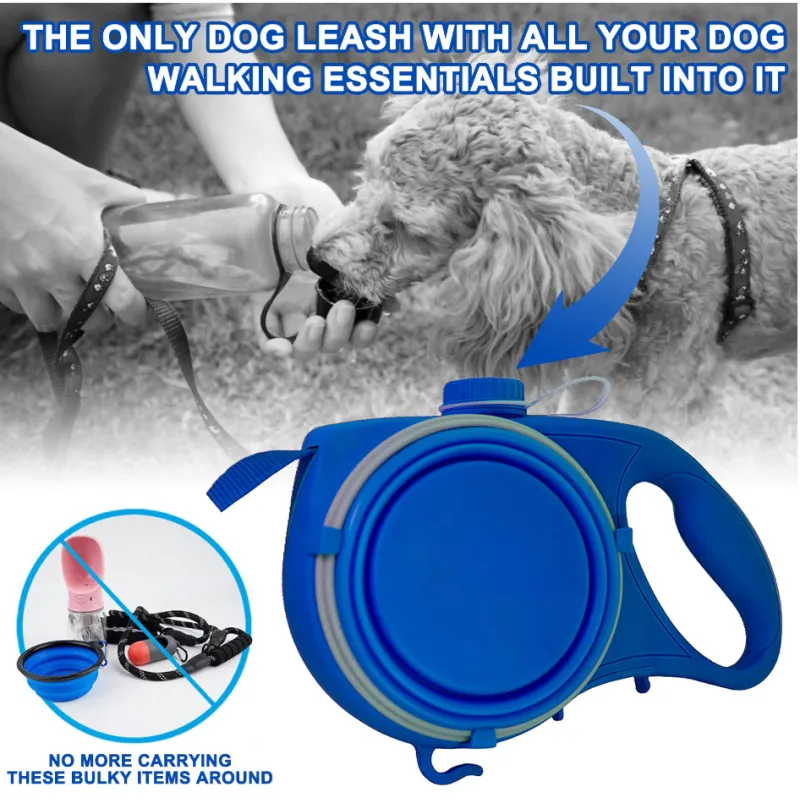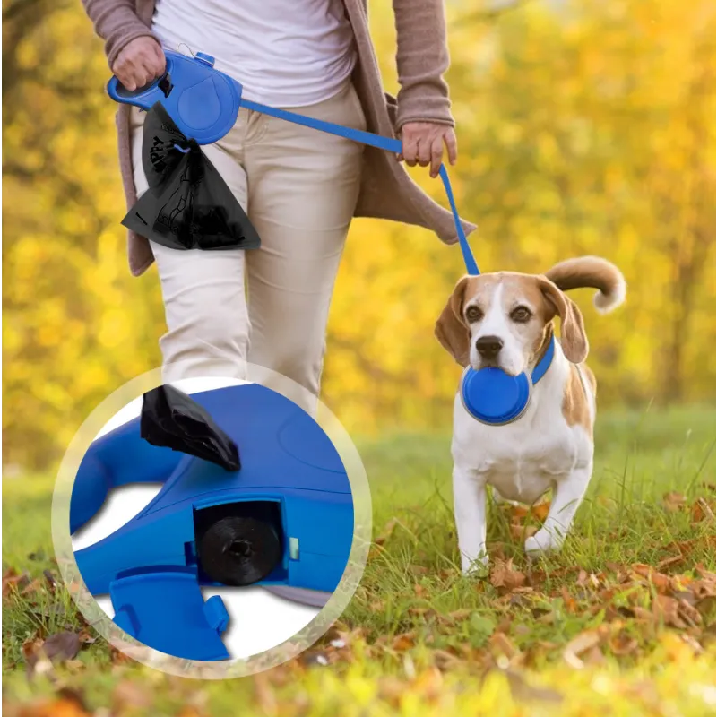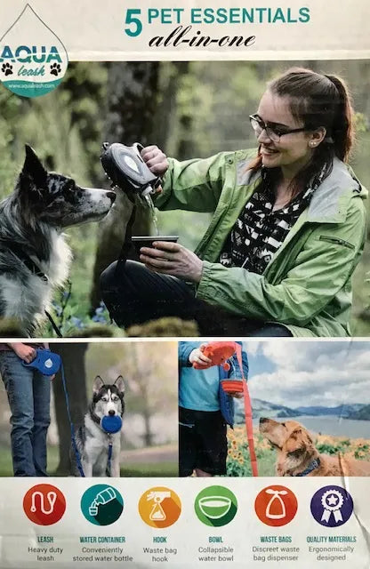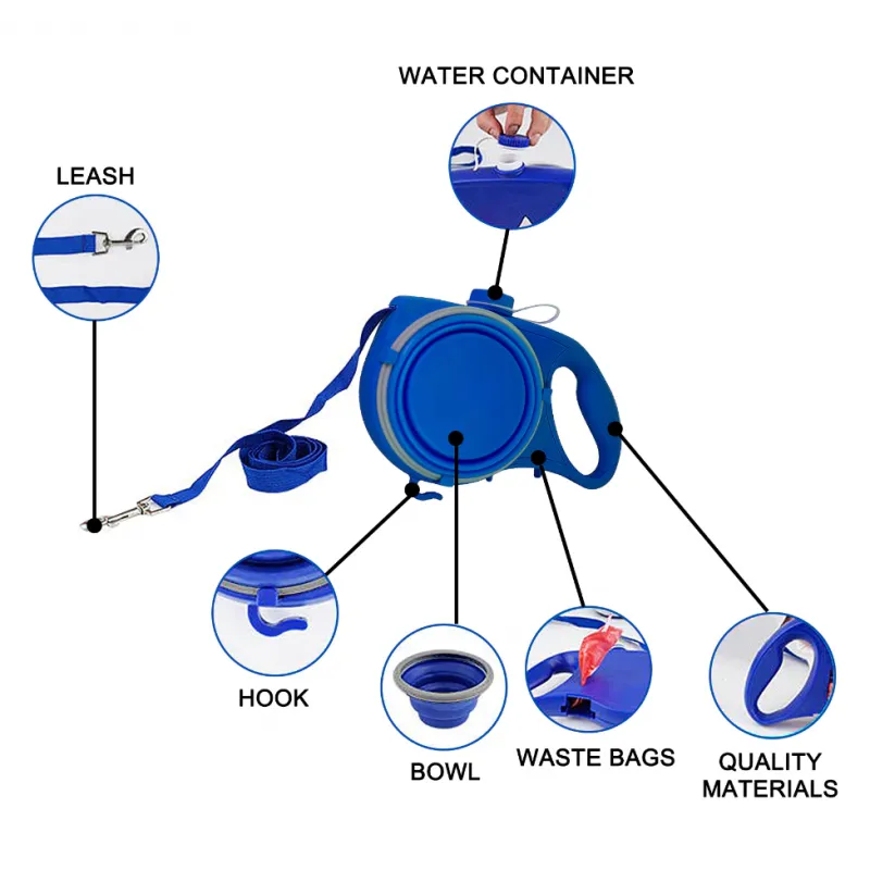 • تشتمل هذه الأداة على كل ما تحتاجه لمشيك اليومي – المقود وزجاجة الماء والوعاء القابل للطي وموزع أكياس النفايات وخطاف لحمل أكياس النفايات المستخدمة.