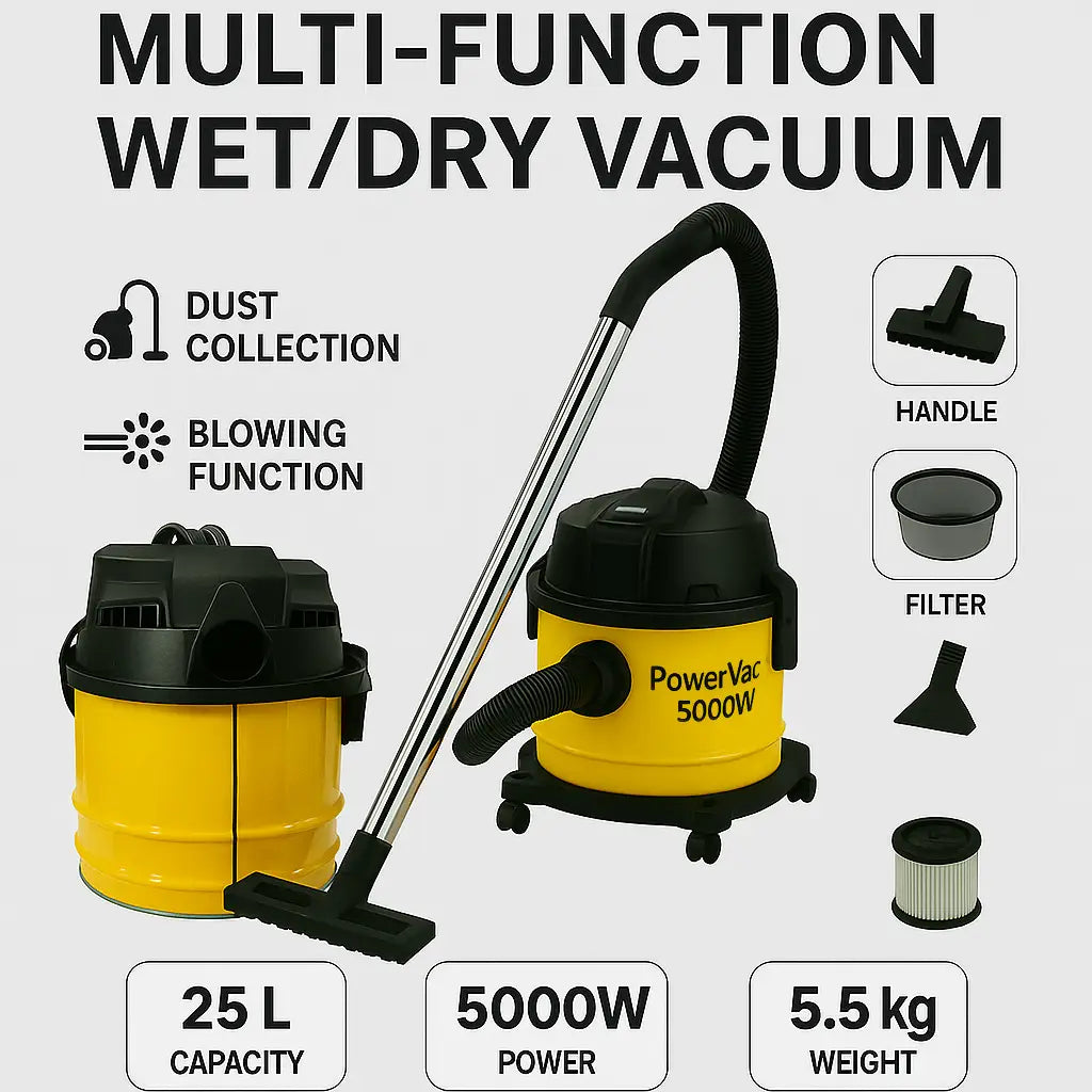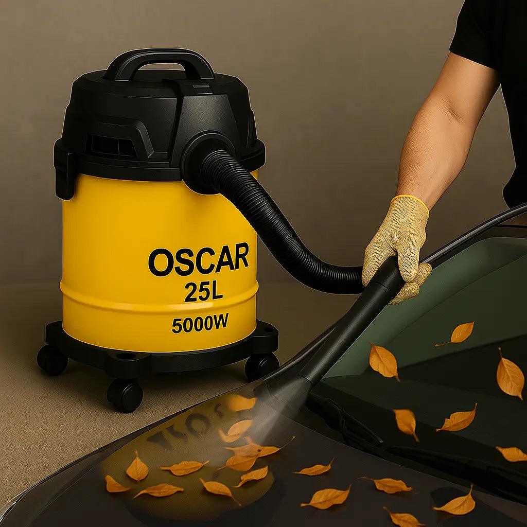 توفر مكنسة OSCAR PowerVac بقوة 5000 واط تنظيفًا رطبًا وجافًا قويًا بفضل أسطوانة متينة من الفولاذ المقاوم للصدأ بسعة 25-30 لترًا. مزودة بعجلات دوارة بزاوية 360 درجة لحركة سلسة، ونظام شفط ونفخ مزدوج الوظائف، مما يجعلها مثالية للتنظيف العميق في المنزل أو المكتب أو المرآب.