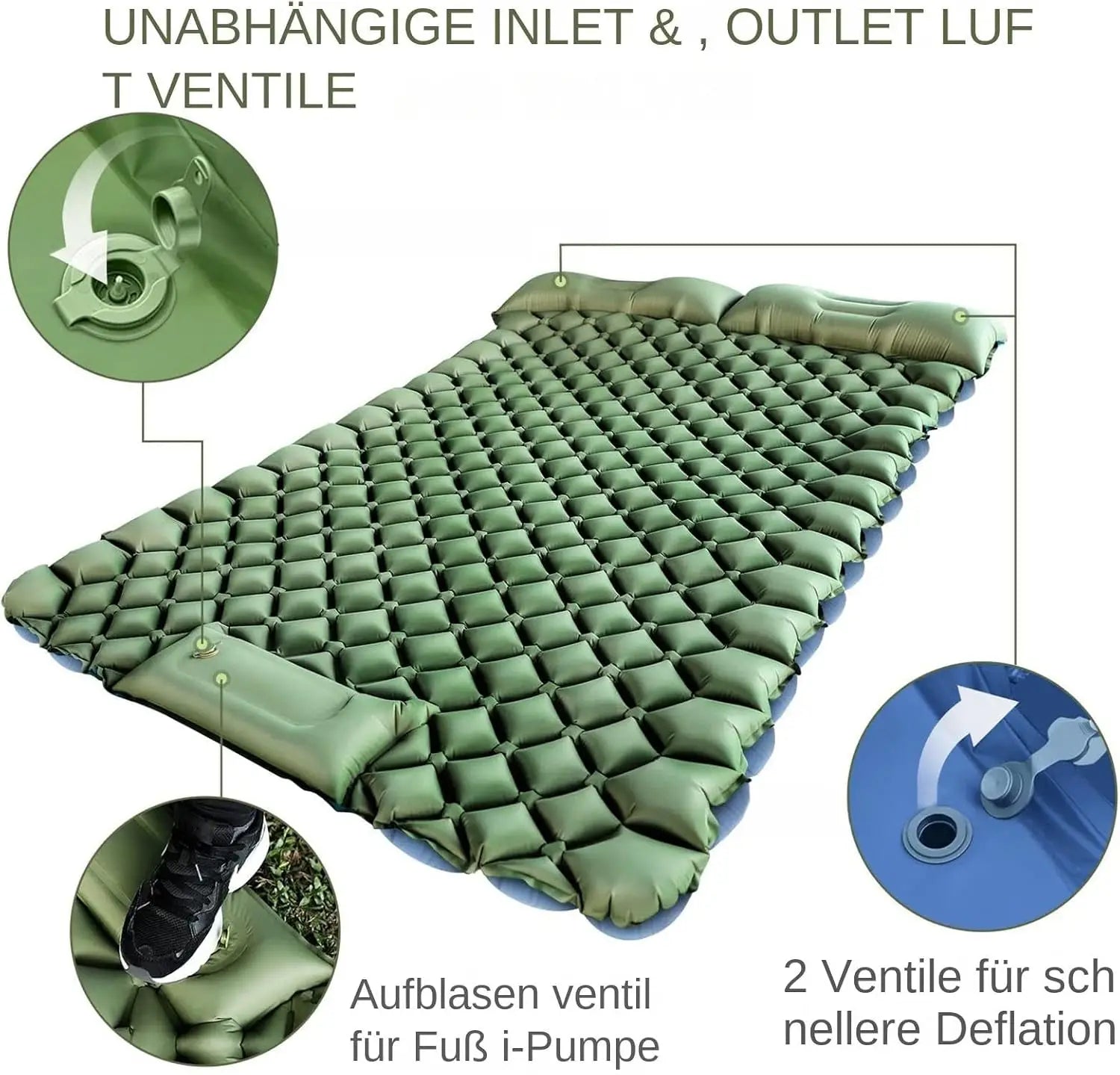• مضخة قدم مدمجة - يمكن نفخها في غضون دقيقتين بدون أدوات خارجية.