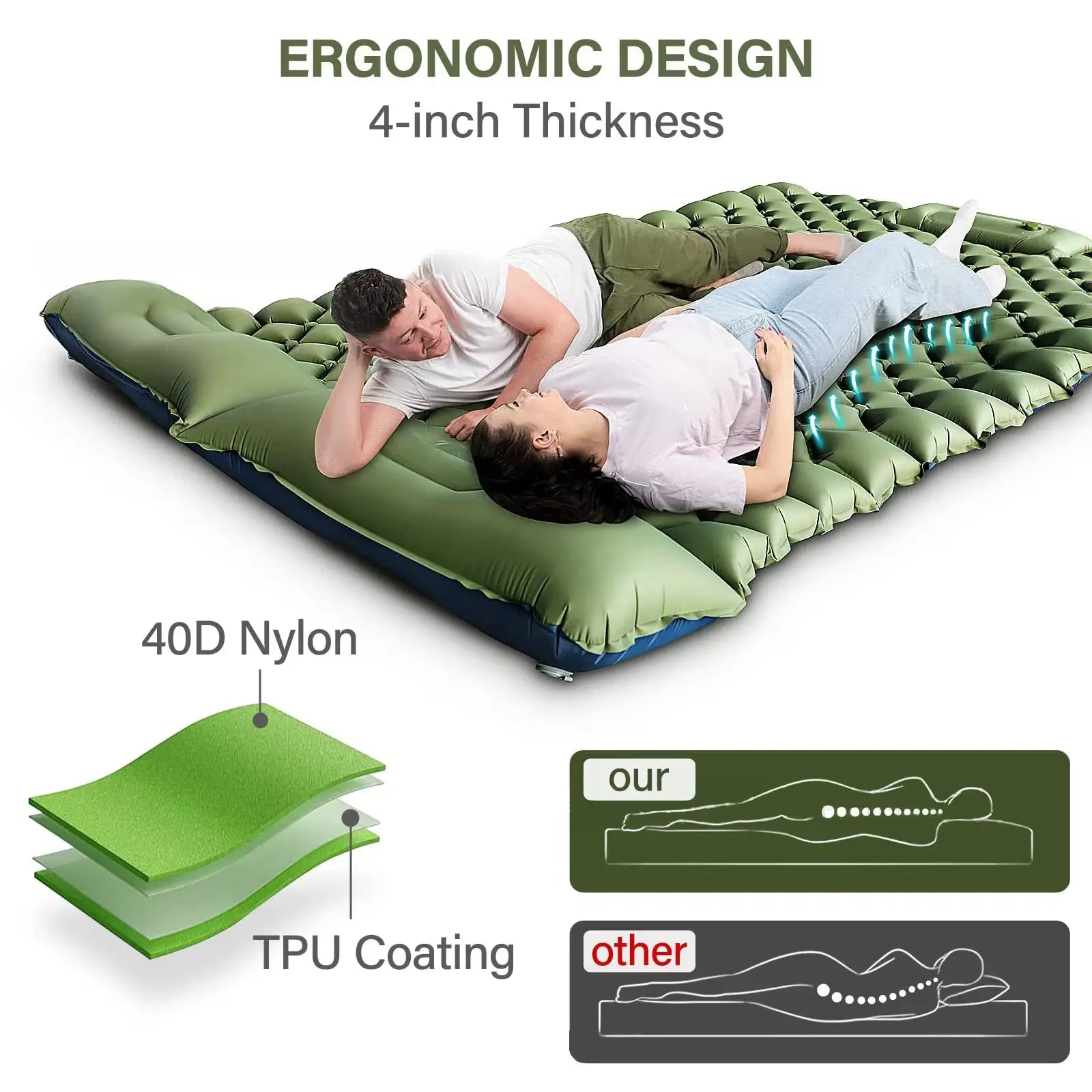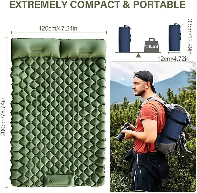 استمتع براحة لا مثيل لها في الهواء الطلق مع سرير النوم الهوائي المزدوج القابل للنفخ المصمم خصيصًا للتخييم والمشي لمسافات طويلة وصيد الأسماك والرحلات الشاطئية وحمل الحقائب على الظهر.