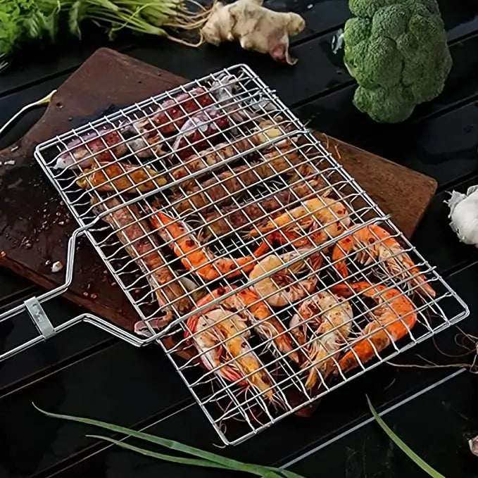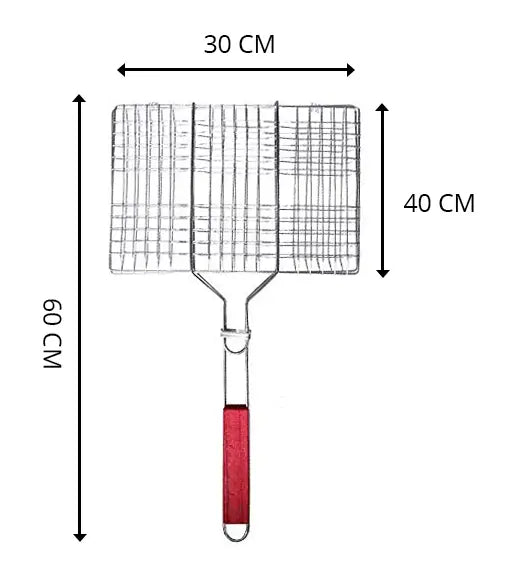 ارتقِ بتجربة الشواء مع حامل الشبكة الشبكية المصنوع من الفولاذ المقاوم للصدأ. مصنوع من فولاذ عالي الجودة مطلي بالكروم، آمن غذائيًا، يتميز هذا الملحق بالمتانة وسهولة الصيانة. تضمن المادة السميكة والفجوات الشبكية توزيعًا متساويًا للحرارة، مما يمنع قطع الطعام الصغيرة من السقوط. يضمن المقبض الخشبي المقاوم للحرارة الأمان أثناء الاستخدام، بينما يضيف تصميمه الذكي القابل للقفل والطي راحة وثباتًا لتجربة الشواء. خفيف الوزن وقابل للحمل، هذا الملحق الأساسي للشواء مثالي للمبتدئين والمحترفين على حد سواء.