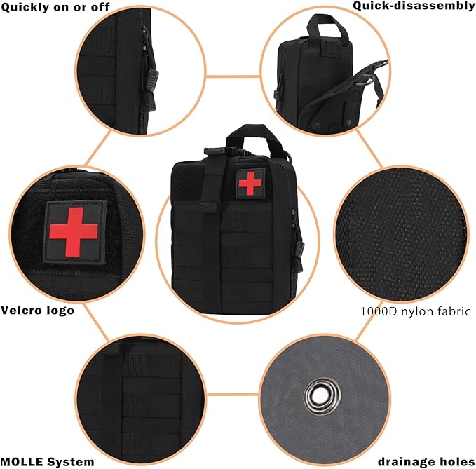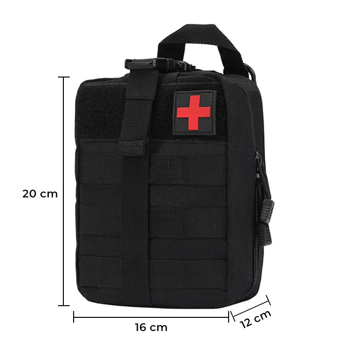 Key Features: • High-quality nylon material bag. • Compact and lightweight design for easy carrying. • Tactical system for attachment to various gear. • Elastic compartments for organized medical supplies. • Quick-release Velcro panel for fast access. • 100 essential medical items for outdoor emergencies