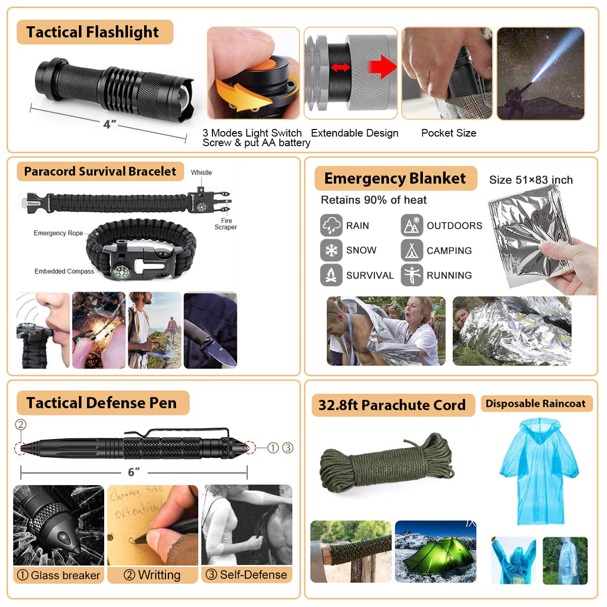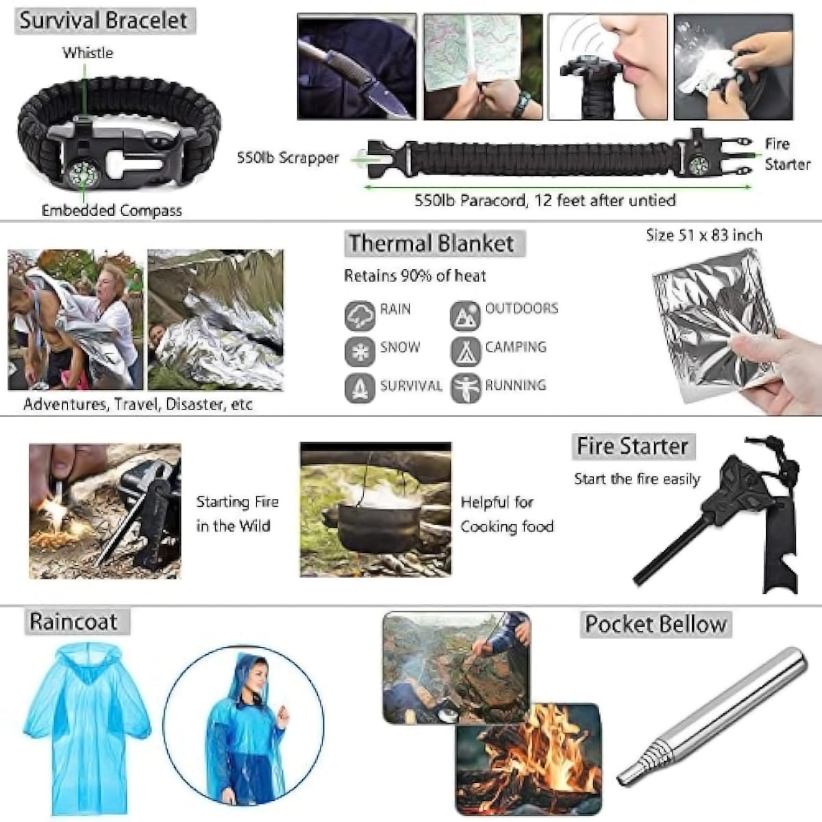 Whether you're camping through mountains or outdoors, or just want to be prepared for roadside emergencies, this 100-piece kit ensures you're always ready to respond. Trusted by outdoor enthusiasts and emergency preppers alike, it’s the smart way to stay safe — anytime, anywhere.