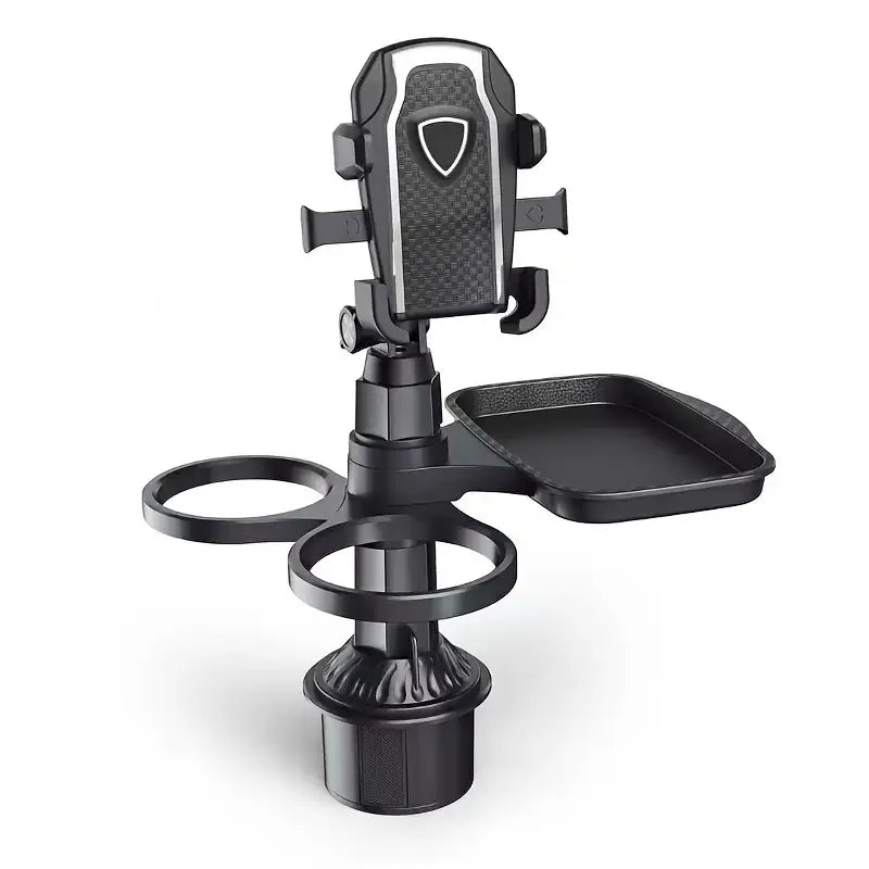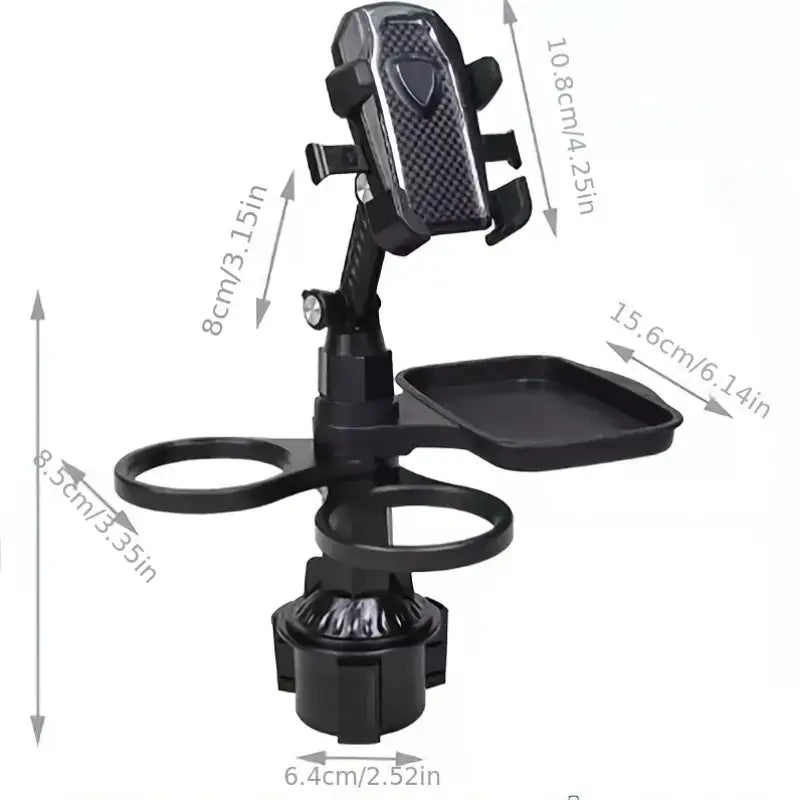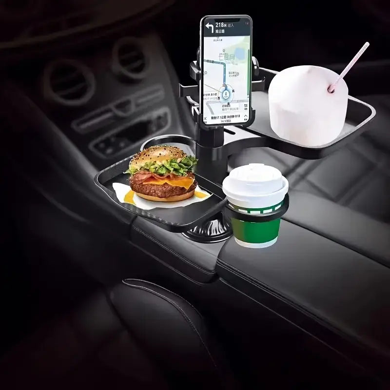 A versatile in-car organizer combining a phone holder, dual cup holders, and an adjustable tray. Perfect for keeping drinks, snacks, and your phone secure and accessible.