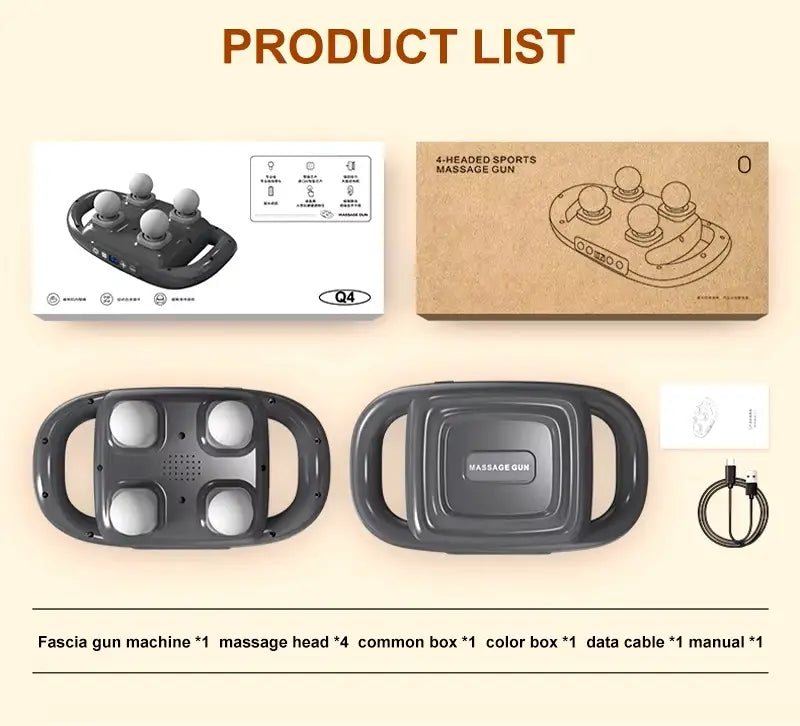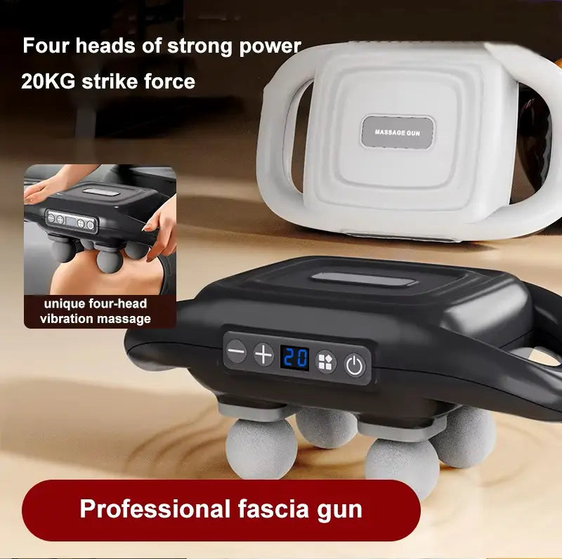 Soothe muscle pain with the 4-headed Handheld Massage Gun. Featuring 9 modes, a silent motor, USB charging, and a user-friendly LCD display, it’s perfect for quick recovery and relaxation.