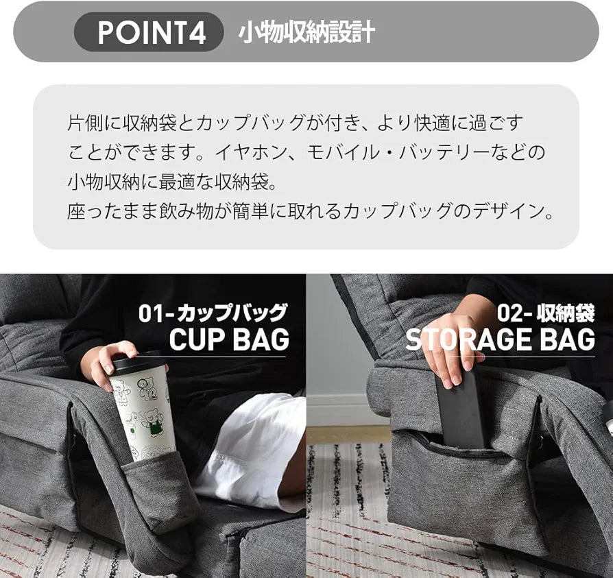 • Side Storage Pockets – Keep headphones, remotes, or phone battery within reach