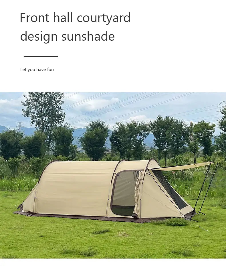 Elevate your camping experience with the Outdoor Chanodug Tunnel Tent. This weather-resistant tent features a one-bedroom, one-living room design for ample space, equipped with a durable fiberglass frame and rugged, waterproof materials. The courtyard design adds a touch of luxury to your outdoor experience. Rainproof, wind-resistant, and featuring a silver-coated sunscreen, this tent ensures you stay comfortable in all seasons. Easy to set up, it comes with quality zippers, reinforcement buckles, and storage bags for added convenience. Enjoy the outdoors without compromise.