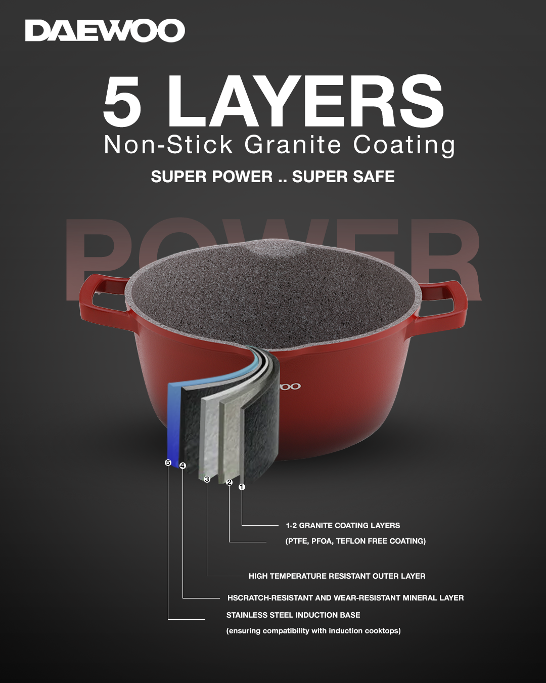 Daewoo 28cm Die-Cast Aluminum Casserole Pot with Lid, Non-Stick Granite Stone Coating, Full Induction Base, Oven-Safe, Red, Chemical-Free Main