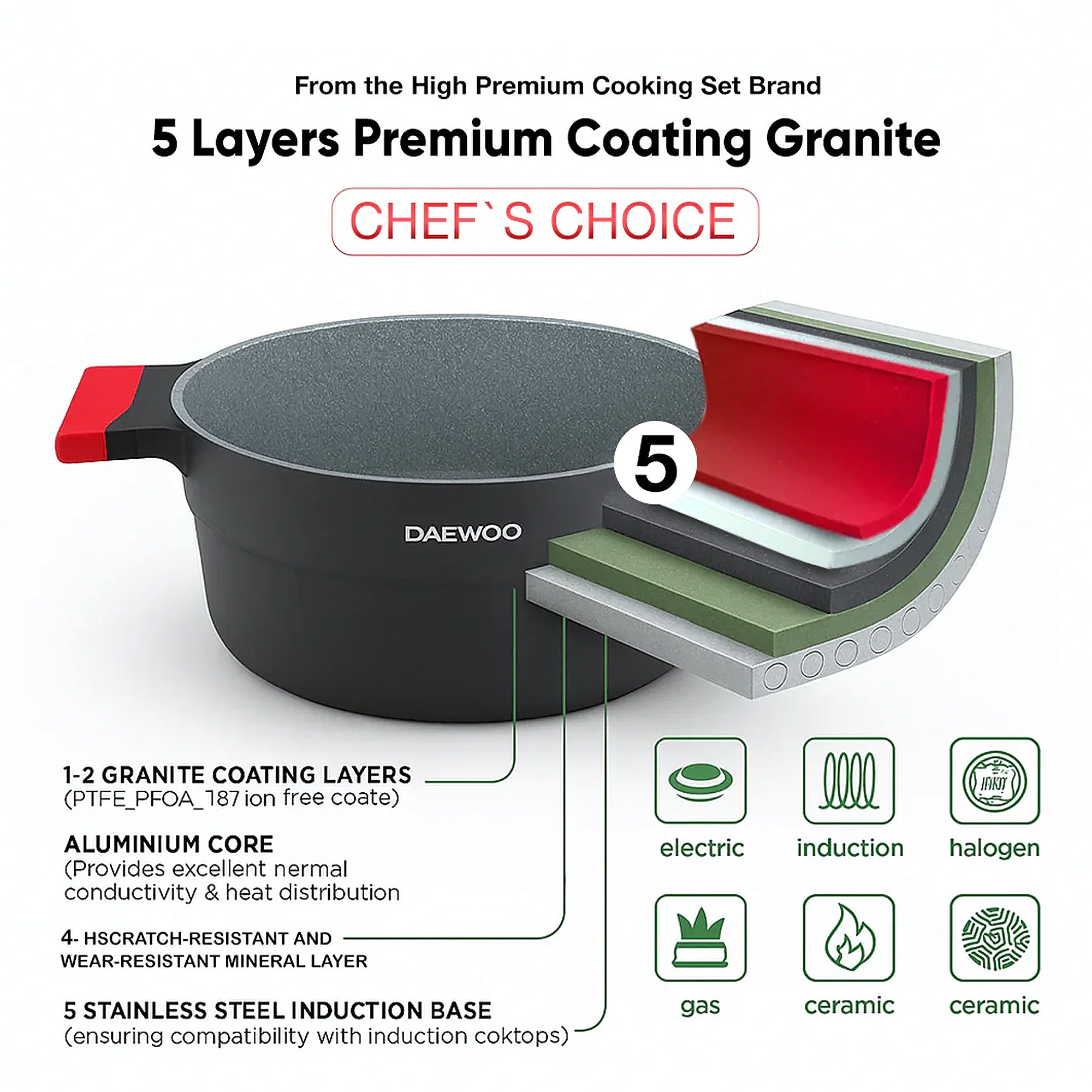 Discover excellence in every meal with the Daewoo 9-Piece X Series Cookware Set. Designed to deliver elegance, durability, and versatility, this set combines the strength of die-cast aluminum with a premium 2-layer non-stick marble coating for effortless cooking and easy cleanup. Whether you're creating everyday meals or exploring new culinary techniques, the Daewoo X Series offers superior performance across every stovetop, including induction.