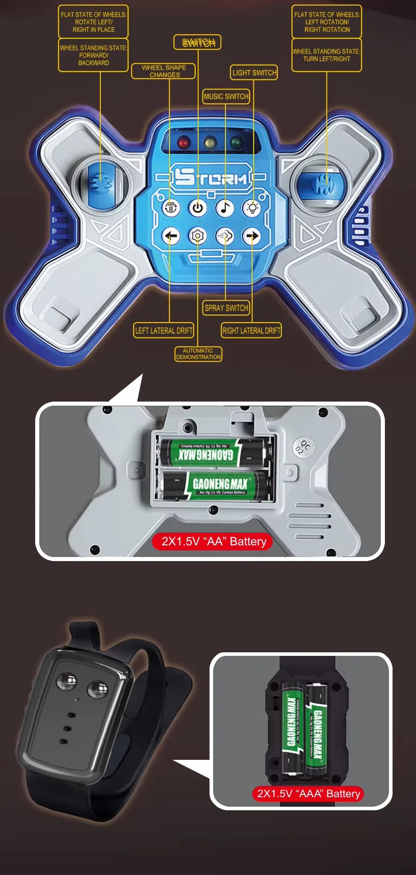 • Control Type: 2.4G Wireless Remote & Watch Gesture Control
