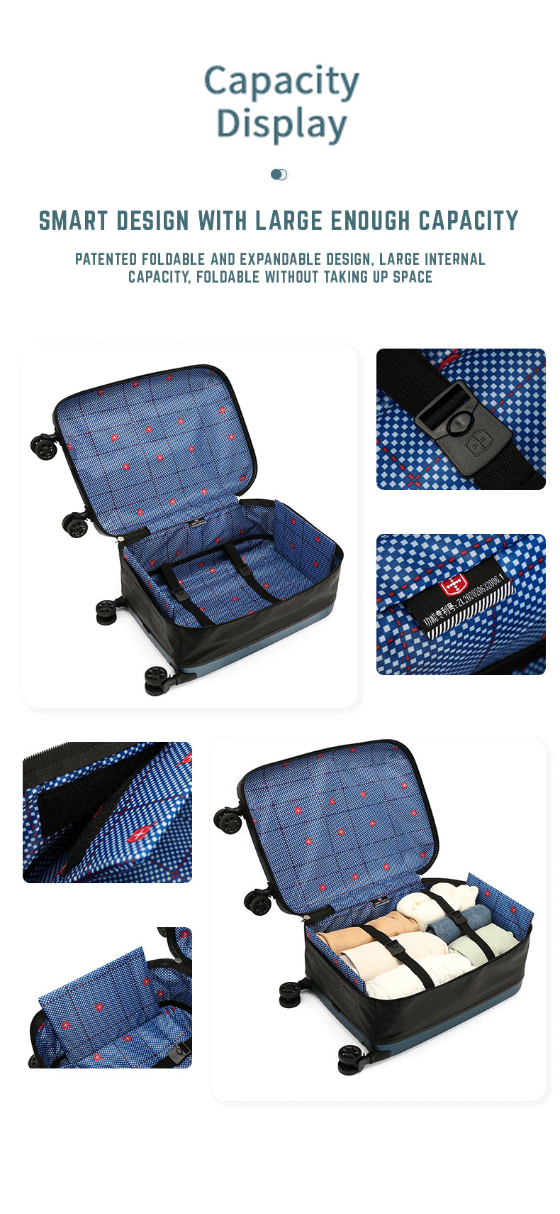 Introducing the 20-inch Expandable Luggage. This intelligently crafted suitcase boasts a folding mechanism, making it effortlessly foldable for compact storage, ideal for today's urban living. Built with structural reinforcement and a three-layer composite structure, it ensures durability and ample space while maintaining a lightweight design. The silent 360° universal wheels, alloy tie rod, and security anti-theft pad lock add to its functionality, promising a smooth, secure, and stress-free travel experience.