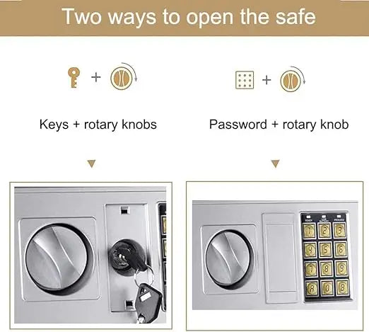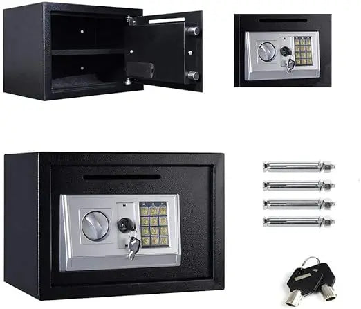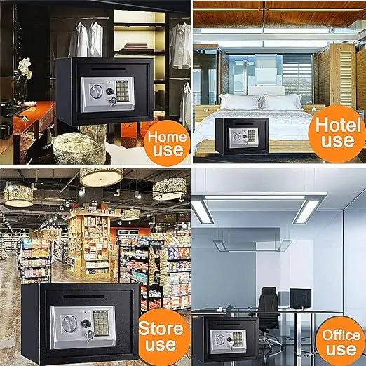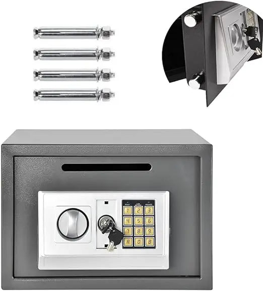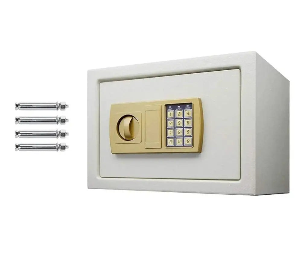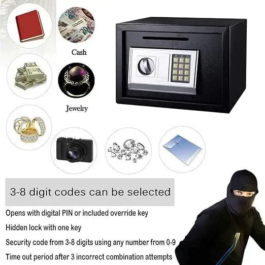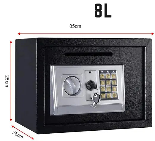 Keep your valuables secure with the Intelligent Electronic Safe Box. This digital safety locker offers 8L capacity, anti-theft protection, and is ideal for both home and office use. Digital keypad for quick and secure access. With a durable steel construction and a digital LED indicator, it's designed for longevity and convenience. The tri-bolt locking system and two manual override keys provide peace of mind during emergencies, ensuring your belongings are always protected. Safeguard your assets with ease.