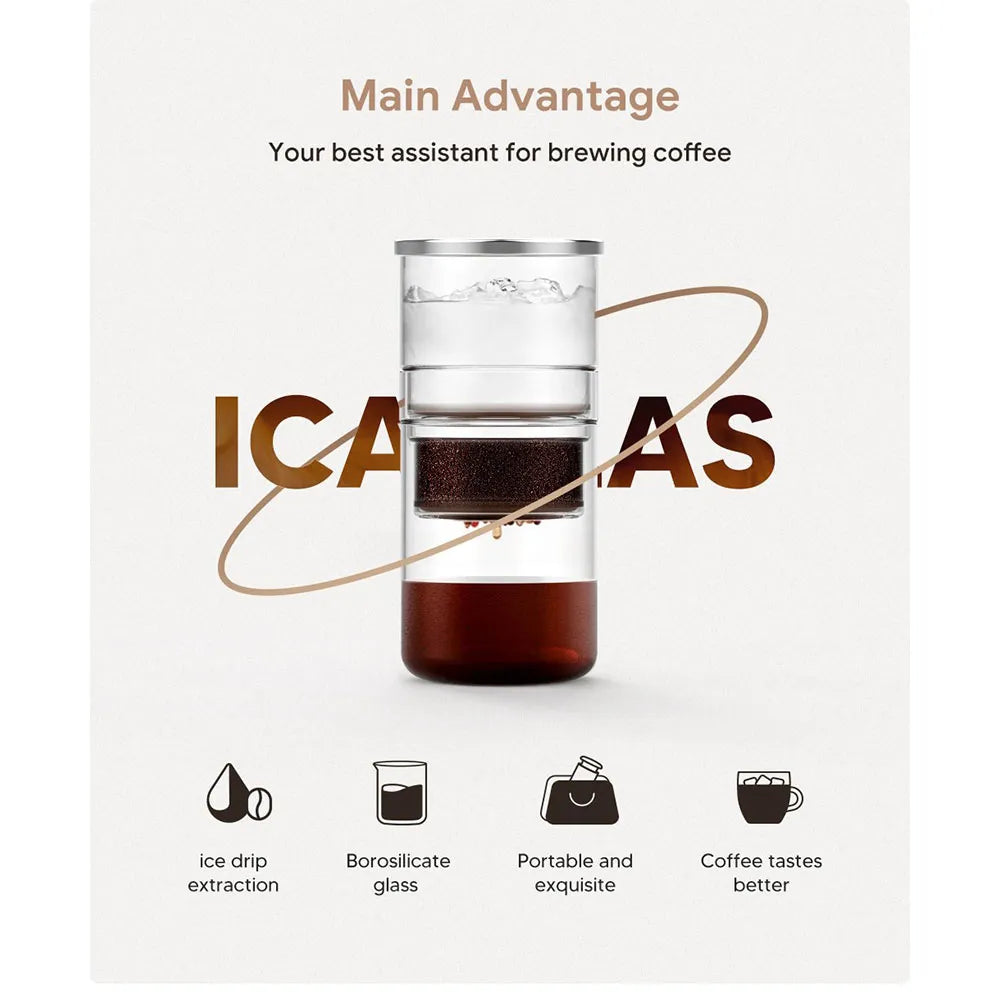The iCafilas cold brew coffee maker lets you prepare smooth, low bitterness coffee using a simple cold drip method.With a 300ml capacity, it produces enough coffee to keep you refreshed throughout the day. Its borosilicate glass body maintains temperature stability while preserving pure coffee taste. The stainless steel and food grade silicone filter ensures clean, safe, and consistent brewing results.Compact and portable, it is ideal for home, office, travel, or outdoor coffee preparation.