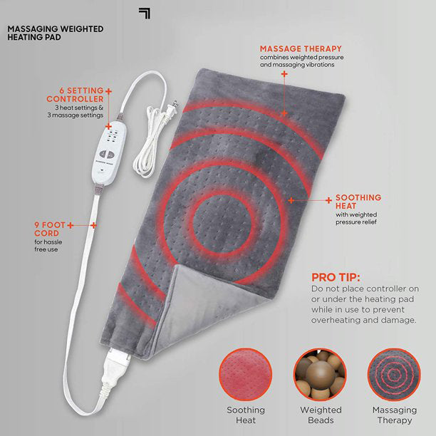 Calming Heat Weighted Massaging Heating Pad revolutionizes relaxation by combining the benefits of weighted pressure, an extra-large heating pad, and soothing massaging vibrations. The heat is absorbed into weighted clay beads, providing targeted relief to muscles and joints. Made with a soft, luxurious fabric, its weighted design and no-slip feature ensure it stays in place. Calming Heat helps ease muscle aches, loosen stiff joints, calm arthritis pain, and soothe menstrual cramps. With a 9-foot cord and one-touch controller, it offers six customizable settings, including 3 heat and 3 massage options. Automatic shut-off guarantees safety.