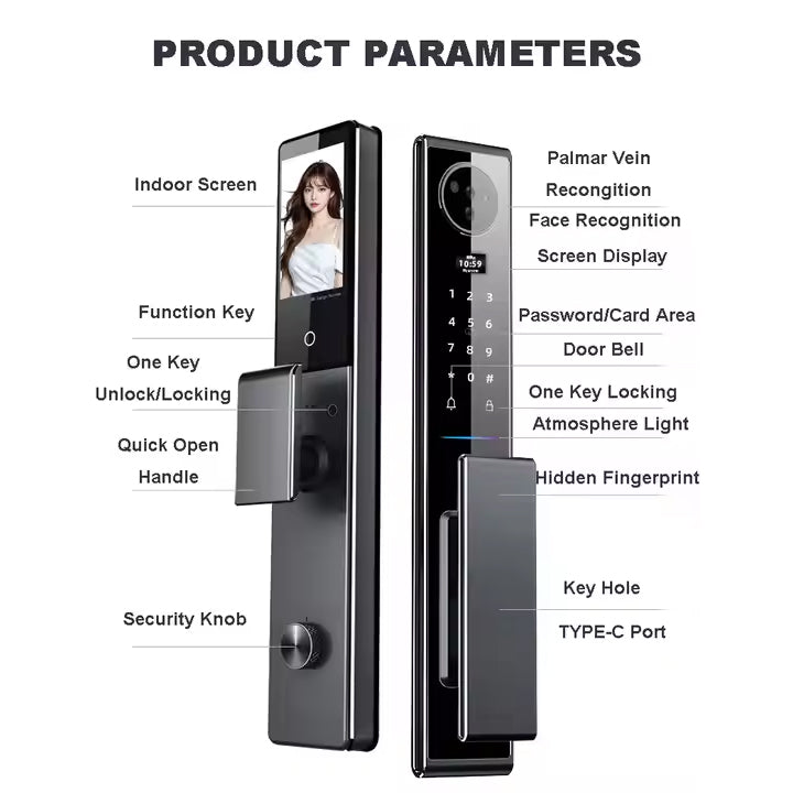 Step into the future of home security with the Opson 3D Face & WiFi Smart Lock! This advanced biometric door lock combines 3D facial recognition, palm vein scanning, fingerprint authentication, and password access for unmatched security. Featuring a 4.5” indoor display, visual cat-eye monitoring, and remote intercom via the Tuya app, you can see, talk, and control access from anywhere. Enjoy multiple unlocking methods, automatic locking in 0.5 seconds, and a solid aviation aluminum build for durability and fire resistance.