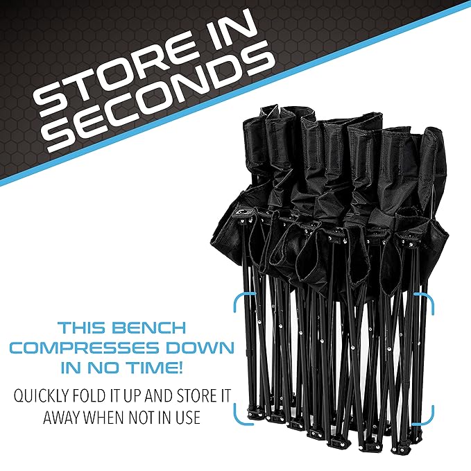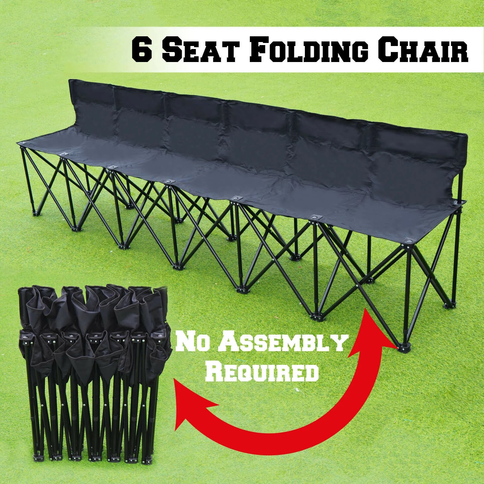 The 6-Person Portable Chair is a game-changer for outdoor, sports, camping trips, and home gatherings. Its lightweight and collapsible design provides instant seating for six people. No setup is needed—simply unfold and enjoy. The quality construction with a collapsible steel frame and vertical support poles ensures stability, with each seat accommodating up to 80-100 kgs. Easily portable with a travel bag included, this bench is perfect for on-the-go seating at the field, park, or beach. When the event is over, it compresses down in seconds for quick storage. An ideal solution for all kinds of setups.