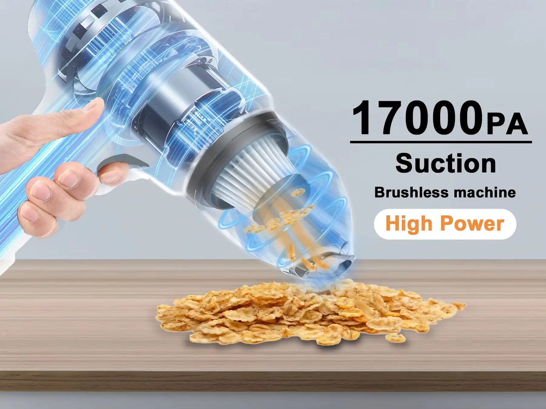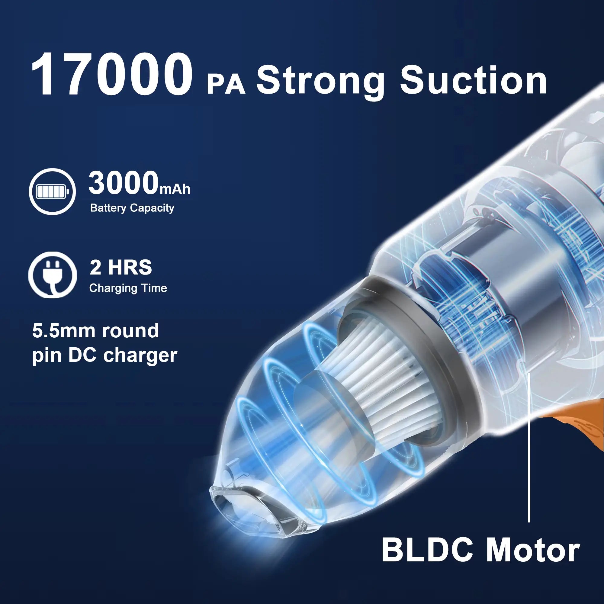 • 17000PA suction power with 150W brushless motor