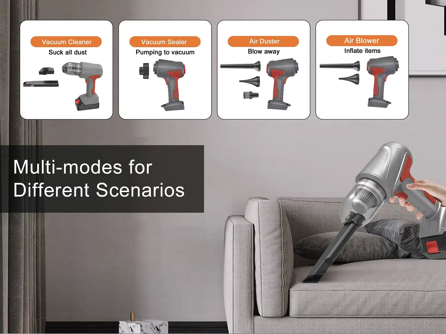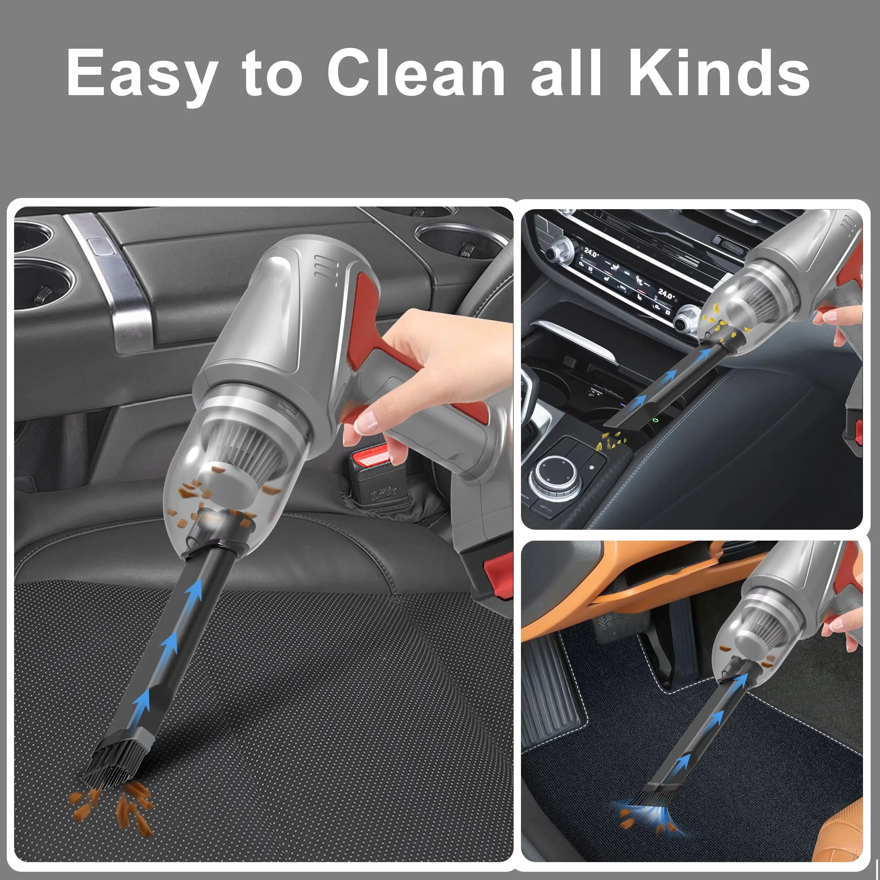 Experience next-level cleaning with this 4-in-1 multifunctional cordless handheld vacuum. With 17000PA suction, a 150W brushless motor, removable rechargeable battery, ultra-fine HEPA filter, and 9 multi-surface accessories, it’s perfect for homes, cars, hotels, and pet hair removal. One single device for four purposes: Vacuum Cleaning, Blowing, Vacuum Sealing & Inflating.