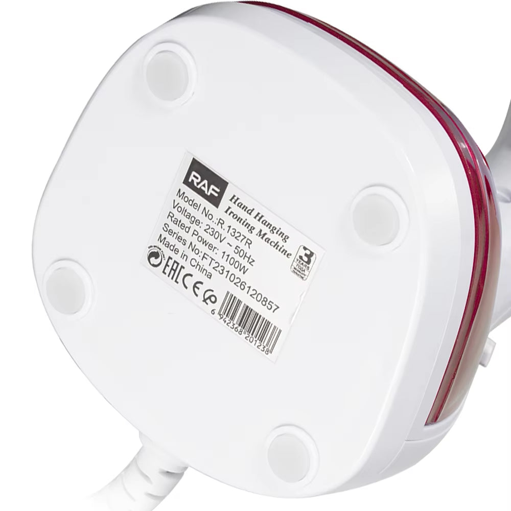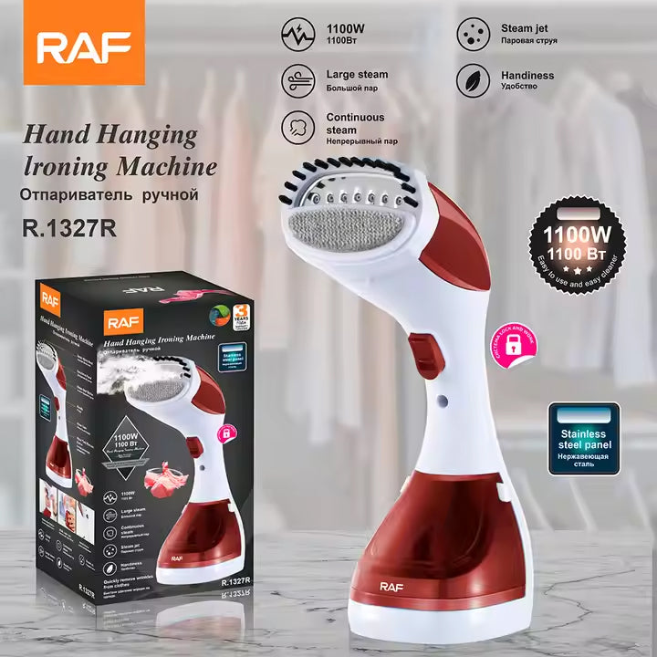 The RAF 1100W Handheld Hanging Steam Iron delivers powerful continuous steam to remove wrinkles quickly. Featuring a stainless steel panel, ceramic soleplate, and a compact design, it's perfect for home or travel.
