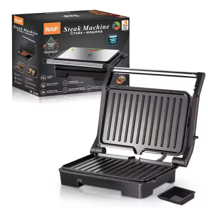 Enjoy evenly cooked meals with the RAF Steak Machine. Its 180° opening, double-sided heating, and non-stick coating make grilling steaks, sandwiches, and breakfasts a breeze.
