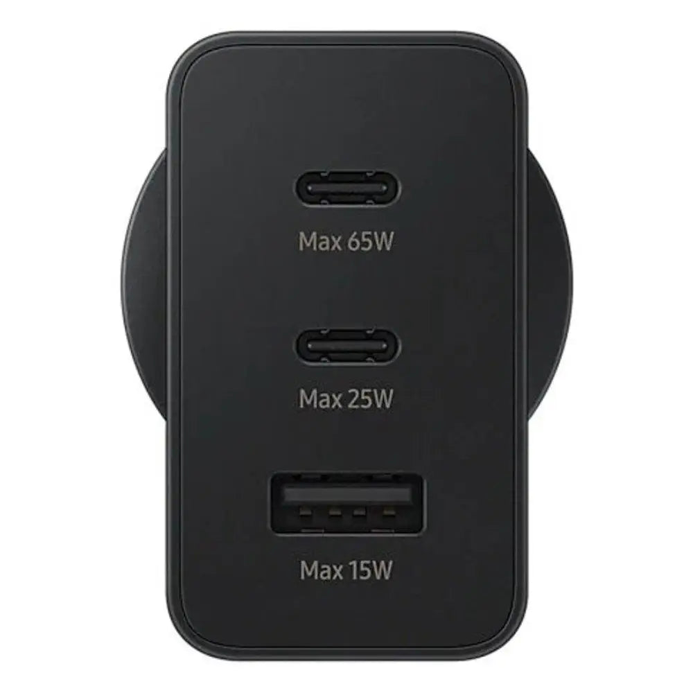 Samsung Trio power adapter, as the name suggests, has three ports, allowing you to charge three devices simultaneously. Two of the ports are USB-C, while the third one is the USB-A port. Samsung Trio charger of 65W allows most of its power only in the first USB-C port, the second has a maximum of 25W, and the USB-A port has up to 15W. When you charge more than one device simultaneously, the watts amount of each port changes. Using the three inputs at once, you will have 35W, 25W, and 15W output power. Free up space in your bag or backpack by replacing up to three of your current chargers with the original Samsung Power Adapter Trio. It offers a way to fast-charge a wide range of compatible devices at their optimal speeds.