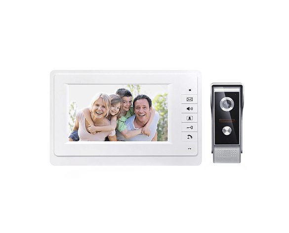 A wired video door phone system with a 7-inch TFT-LCD display, 700TVL night vision camera, and hands-free intercom. Supports remote unlocking, adjustable brightness and volume, and up to 100m transmission distance. Perfect for enhancing home and villa security.