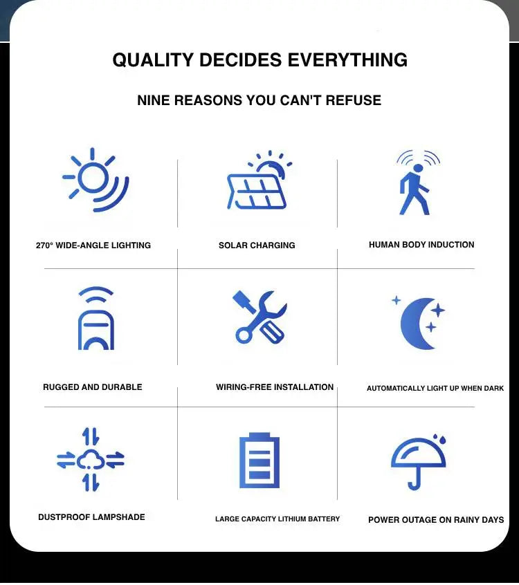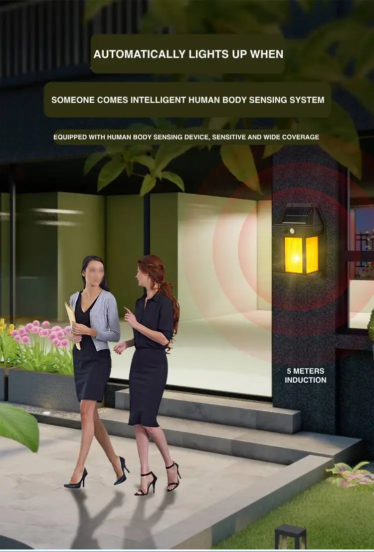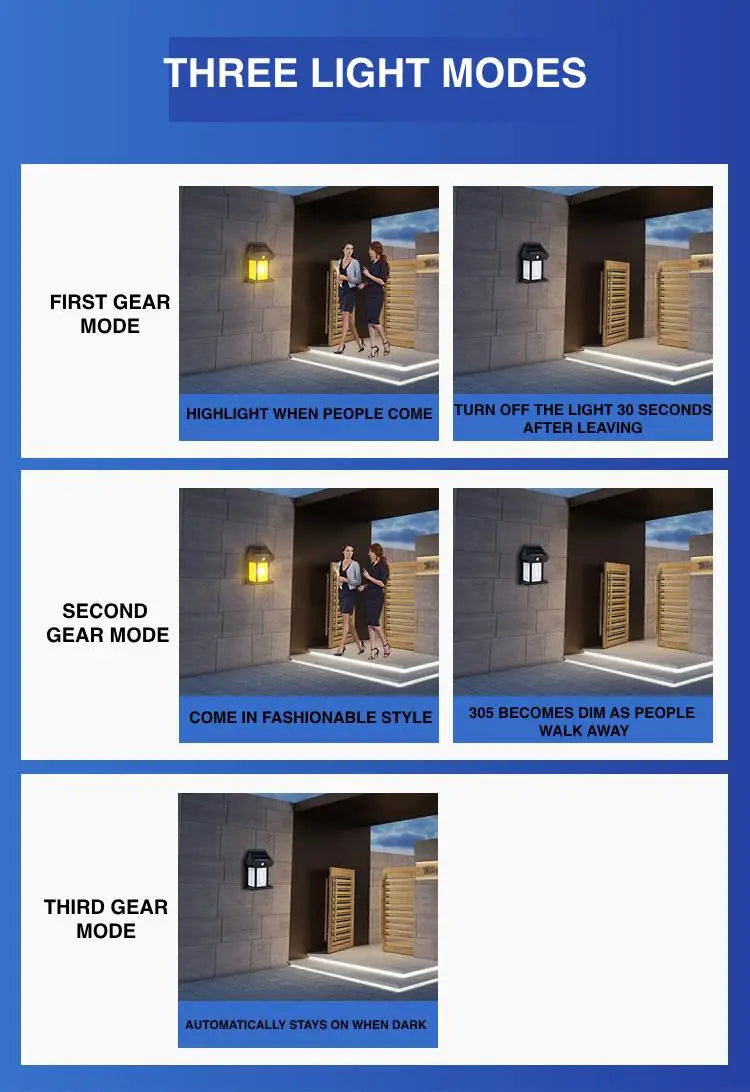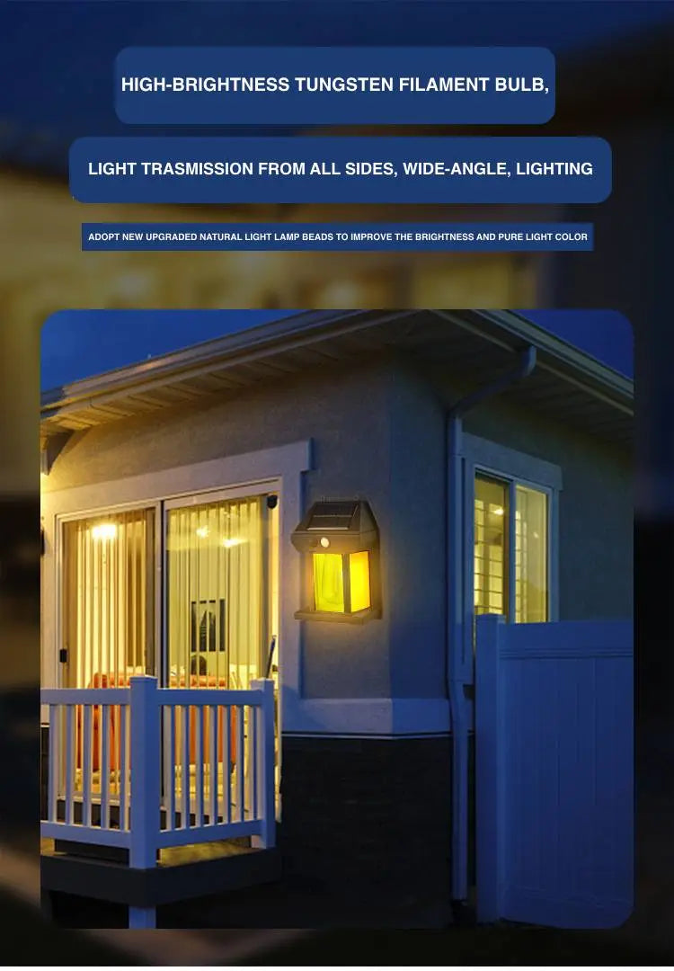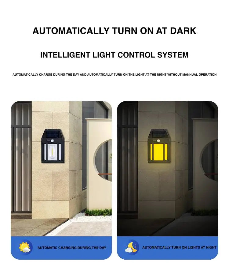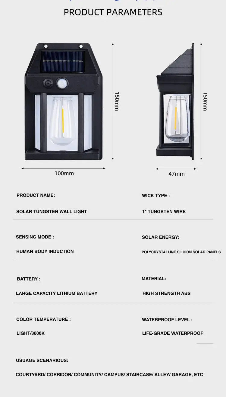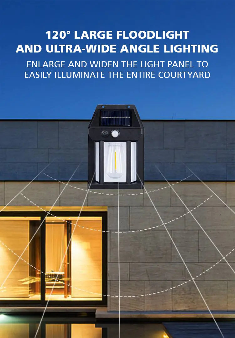 Enhance your outdoor spaces with the Solar Wall Lantern. This modern solar light boasts a large-capacity 1800mAh battery, providing up to 12 hours of lighting with just 6-8 hours of solar charging. Its weather-resistant design, easy installation, and wide application make it an ideal choice for porches, decks, garages, patios, and more. Experience brighter, eco-friendly lighting with Wireless Solar Motion Sensor Wall Lamp– your faithful friend at the front door.